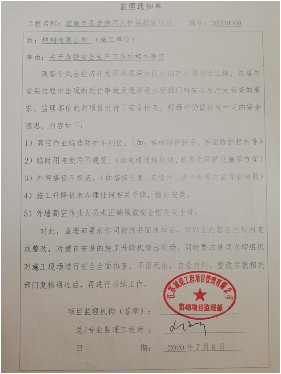 7月7日,集團(tuán)公司總經(jīng)理宋道河帶領(lǐng)公司相關(guān)部門(mén)人員對(duì)正在建設(shè)的孔李淮河大橋治超站進(jìn)行了專項(xiàng)安全檢查。宋總首先聽(tīng)取了項(xiàng)目施工單位安全工作匯報(bào),隨后又深入施工現(xiàn)場(chǎng)對(duì)安全工作進(jìn)行實(shí)地檢查,檢查中發(fā)現(xiàn)部分施工人員未佩帶安全帽安全帶、樓梯扶手不牢固、接地窗戶無(wú)安全護(hù)欄、升降梯未安裝安全門(mén)等安全隱患。檢查結(jié)束后宋總現(xiàn)場(chǎng)要求施工單立即整改并要求項(xiàng)目管理部及監(jiān)理單位加強(qiáng)安全管理工作。監(jiān)理單位按照檢查情況向項(xiàng)目施工單位下達(dá)了監(jiān)理通知書(shū),要求施工單位限期整改并開(kāi)展項(xiàng)目建設(shè)安全工作自查自糾。次日,施工單位已按7月7日檢查要求及監(jiān)理通知單對(duì)項(xiàng)目安全隱患進(jìn)行了整改。