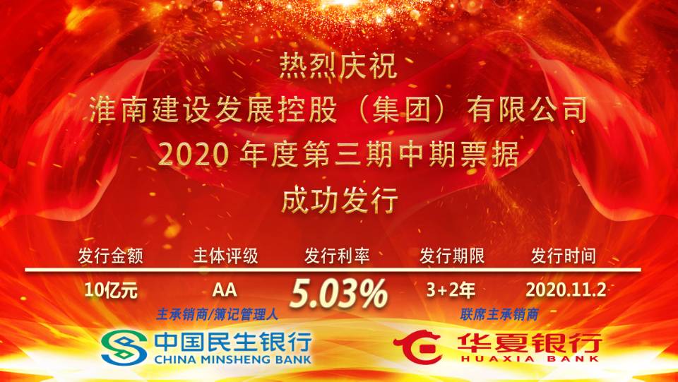 11月2日,建發(fā)集團成功發(fā)行2020年度第三期中期票據(jù),債券簡稱:20淮南建發(fā)MTN003、發(fā)行規(guī)模10億元、票面利率5.03%,認購倍數(shù)達2.8倍。