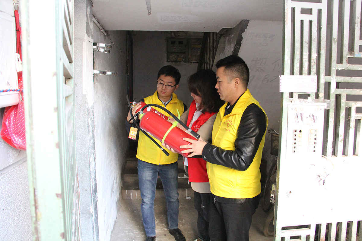 志愿者對(duì)小區(qū)樓道內(nèi)的消防器材進(jìn)行檢查