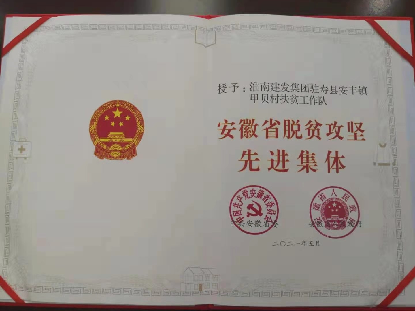 會(huì)議宣讀了《中共安徽省委安徽省人民政府關(guān)于表彰安徽省脫貧攻堅(jiān)先進(jìn)個(gè)人和先進(jìn)集體的決定》,省領(lǐng)導(dǎo)為受表彰的先進(jìn)個(gè)人和先進(jìn)集體代表頒獎(jiǎng)。建發(fā)集團(tuán)駐壽縣安豐鎮(zhèn)甲貝村駐村工作隊(duì)在表彰中獲“安徽省脫貧攻堅(jiān)先進(jìn)集體”榮譽(yù)稱號(hào)。