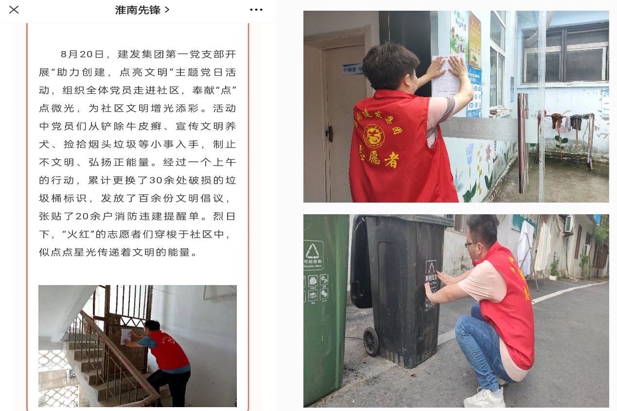 為不斷提升黨支部組織生活質(zhì)效,增強(qiáng)基層黨組織凝聚力和戰(zhàn)斗力,第一黨支部堅持把組織生活與企業(yè)發(fā)展、服務(wù)社會、城市治理等緊密結(jié)合,以“主題黨日”為重要抓手,引導(dǎo)黨員在基層一線亮身份、銘初心、擔(dān)使命,以實際行動踐行黨的宗旨,充分發(fā)揮模范帶頭作用。8月份組織開展的“助力創(chuàng)建,點亮文明”主題黨日活動入選了市委組織部優(yōu)秀主題黨日活動案例,在“淮南先鋒”公眾號刊登。