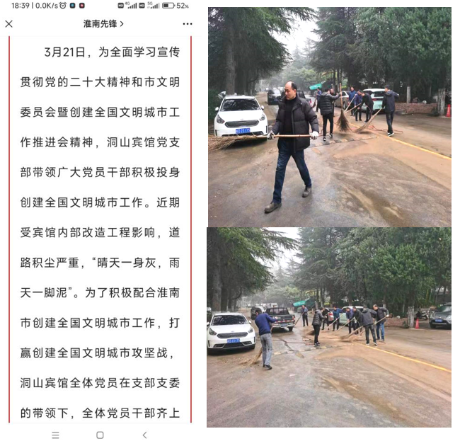 為全面學(xué)習宣傳貫徹黨的二十大精神和市文明委員會(huì )暨創(chuàng )建全國文明城市工作推進(jìn)會(huì )精神,洞山賓館黨支部以“主題黨日”為契機,帶領(lǐng)廣大黨員干部積極投身淮南市創(chuàng )建全國文明城市工作,打贏(yíng)創(chuàng )建全國文明城市攻堅戰,全體黨員干部齊上陣,不怕臟不怕累,清理了賓館院內路面的垃圾,疏通了道路,為全市創(chuàng )建全國文明城市工作貢獻自己一份力量,此次活動(dòng)被市委組織部作為優(yōu)秀主題黨日案例發(fā)布于淮南先鋒網(wǎng)。